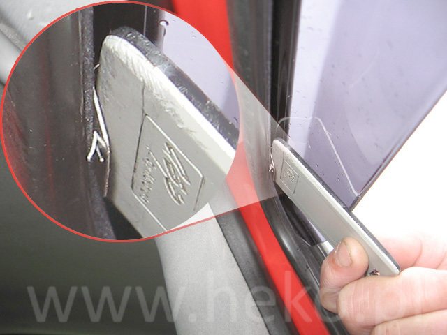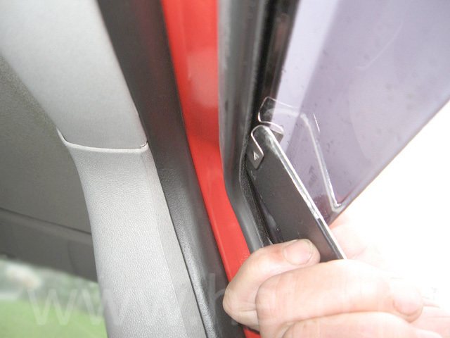 6. Po zasunutí deflektoru zatvorte okno a uistite sa či niekde deflektor neprekáža oknu pri zasúvaní. Ak sa stane, že deflektor naráža na okno, tak je potrebné do toho miesta použiť pliešky, ktoré sú priložené v balení. Pliešok sa vkladá tak, aby časť s ostrým výstupkom bola v tesnení a hladká časť na deflektore. Pliešky môžete použiť aj keď deflektory nikde nenarážaujú. Budú tým lepšie upevnené v tesnení dverí.